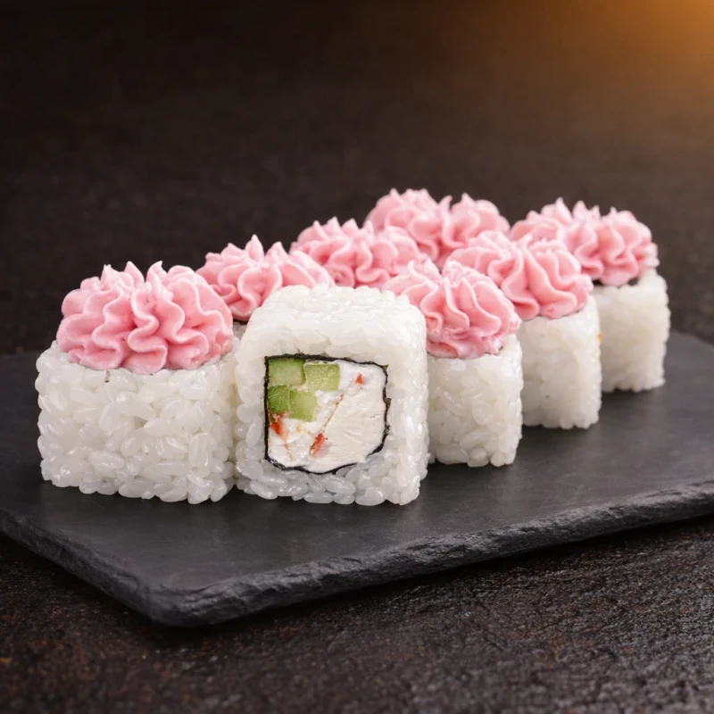 Нежный ролл с крабовыми палочками, творожным сыром и хрустящим огурцом, покрытый соусом Лава (8 кусочков)