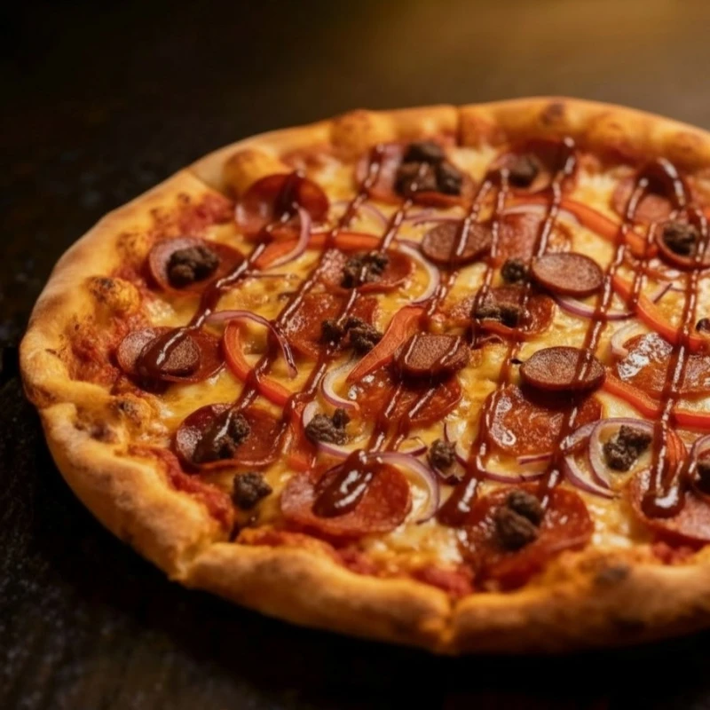Сочная маринованная говядина, пряные охотничьи колбаски, острый пепперони, хрустящий болгарский перец, спелые помидоры и красный лук под тягучей моцареллой, фирменный соус из свежих томатов с орегано и тонкое тесто — насыщенный вкус ранчо с идеальным балансом