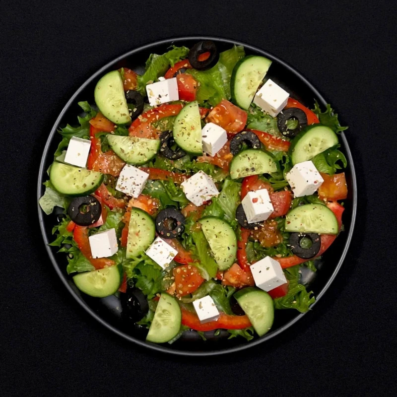 - Хрустящий листовой салат, сладкий болгарский перец, сочные томаты, огурцы и маслины под нежным сыром фета — лёгкость и яркость овощного букета