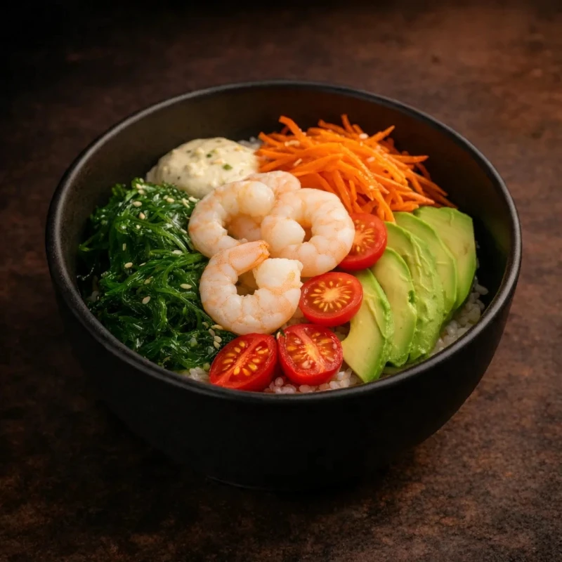 Нежные тигровые креветки с рисом, свежим авокадо и томатами черри. Морковь по-корейски, салат чука, кунжут и соус поке придают блюду насыщенный вкус и лёгкую пикантность. 280г