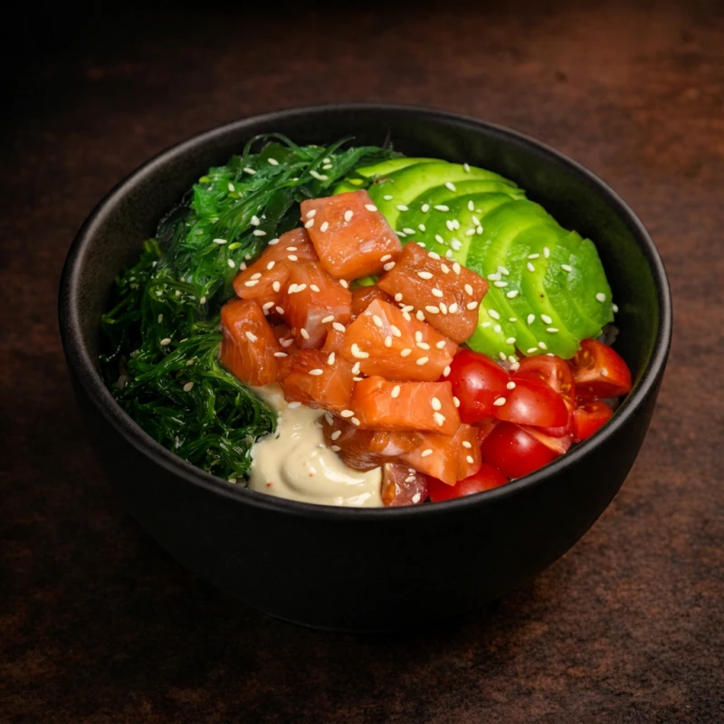 Нежный лосось и рис в сочетании со свежим авокадо, томатами черри и салатом чука. Соус поке и кунжут добавляют блюду насыщенный вкус с лёгкими азиатскими нотками. 280г