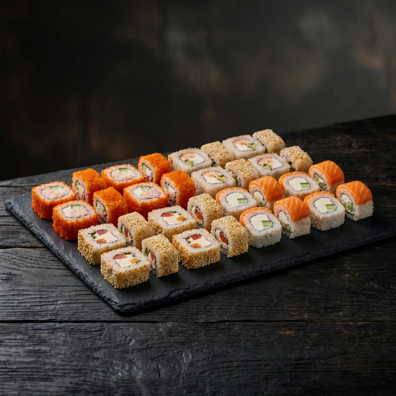 Филадельфия лайт, Ойси, Бостон и Калифорния с крабом — сбалансированное ассорти роллов с лососем, крем-сыром, крабом и свежими овощами. (32шт)