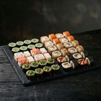 Каппа маки, Чука маки, Изуми, Лава с крабом, Скин и Филадельфия лайт — популярное ассорти роллов с лососем, крабом, тунцом и овощами. (48шт)