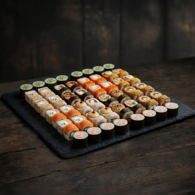 Филадельфия лайт, Калифорния с крабом, Ойси, Каппа маки, Скин, Цезарь темпура, Кани темпура, Тори темпура, Запечённый с курицей и Запечённый с беконом — большое ассорти холодных, горячих и запечённых роллов для компании. (80шт)