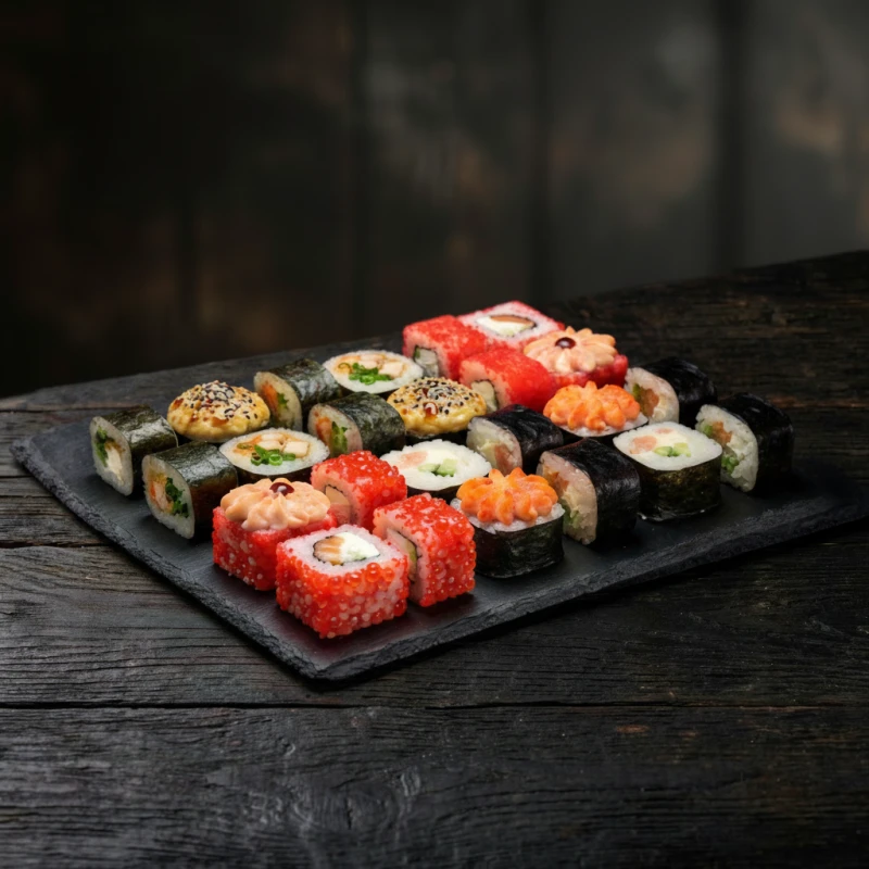 Запечённый с лососем, Запечённый с креветкой и Запечённый с курицей — тёплое ассорти запечённых роллов под нежными соусами. (24шт)