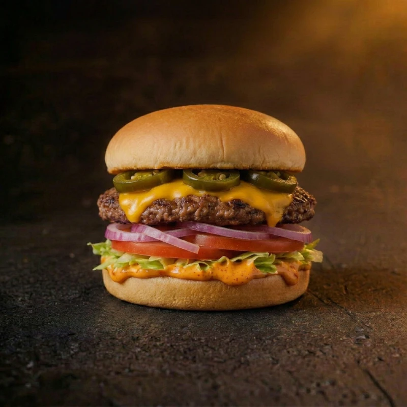 Сочный бургер с говяжьей котлетой, сыром чеддер и свежими овощами. Красный лук, свежие томаты, хрустящий салат айсберг и острый перец халапеньо дополняются пикантным соусом спайс. 260г