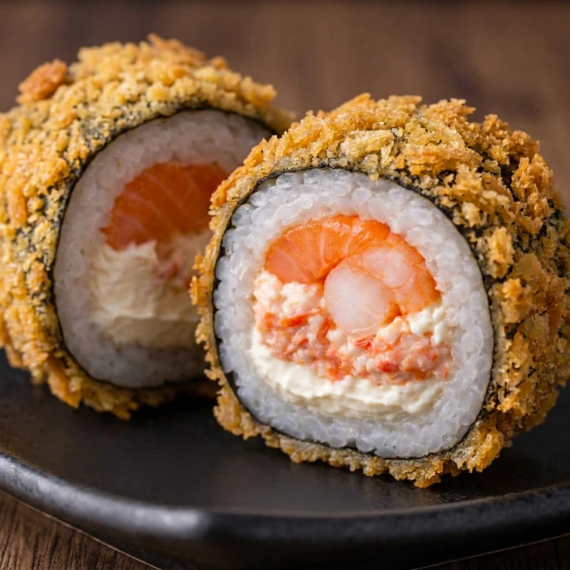 Сытный тёплый ролл с тигровыми креветками, крабовыми палочками, нежным лососем и творожным сыром в хрустящей темпурной панировке (8 кусочков)